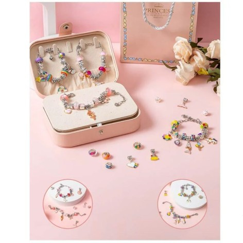 Набір прикрас у стильній скриньці – справжнє втілення дівочих мрій! Він включає різні основи для майбутніх браслетів, а також великий вибір різноманітних намистин, які можна комбінувати між собою, як забажає. Набір допоможе навчитися створювати свої прикраси та відкриє дівчинці простір для творчих експериментів.